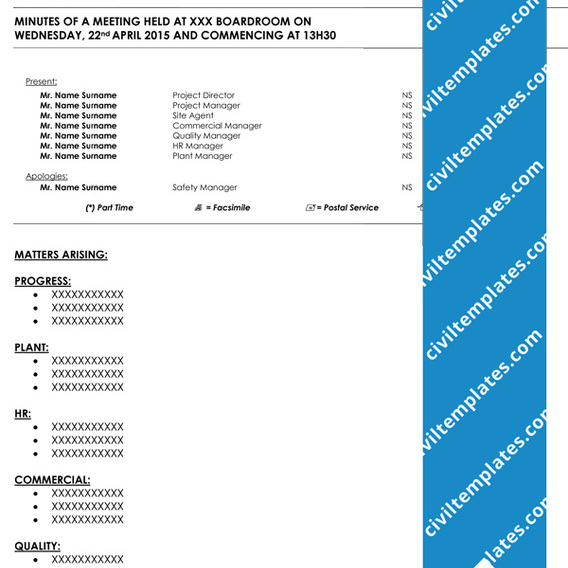 Weekly Planner template (xls), Site Daily Diary template (doc), Weekly Productivity Cost per metre (xls), Daily Asphalt report (xls), Manpower Resource template (xls), Labour register template (xls), Asphalt mix design template (xls), Asphalt completion schedule template (xls), Layer works template (xls), Road profile template (xls), Surface seal template (xls), Project filing system template, File label template (xls), Drawing issue register (xls), Monthly Plant return (xls), Cost to completion spreadsheet (xls), Project detail template (xls), project start up check list (xls), Weekly project report (doc), project progress report template, Project performance report (xls), Tender Recommendation form (xls), project directory template, project authority template, limits of authority template, authorised signature template, Annual leave schedule (xls), project timetable template, meeting minutes template, site instruction template, document review template, document approval template, Request for information (xls), project submittal template (xls), Confirmation of verbal instruction (xls), daily material reconciliation sheet (xls), Project team template, Project organogram template, KPI templates, Project executive summary (xls) and Critical Path Method (xls), Weekly Progress Update (xls) and Weekly Traffic Disruption Report (xls).